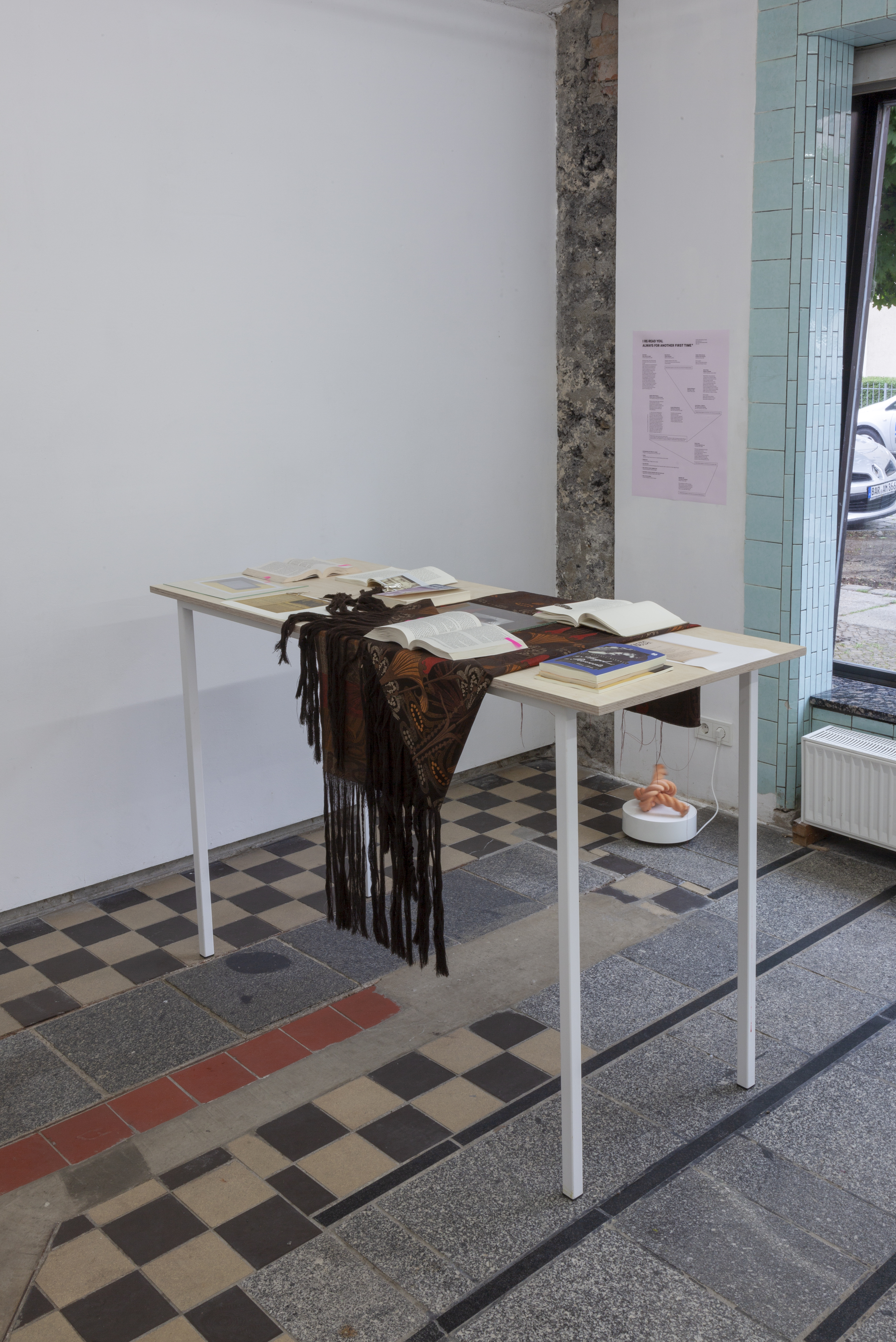 Installation made of books, photographs, prints, accessoires, textile, glas, metall, wood, 2018